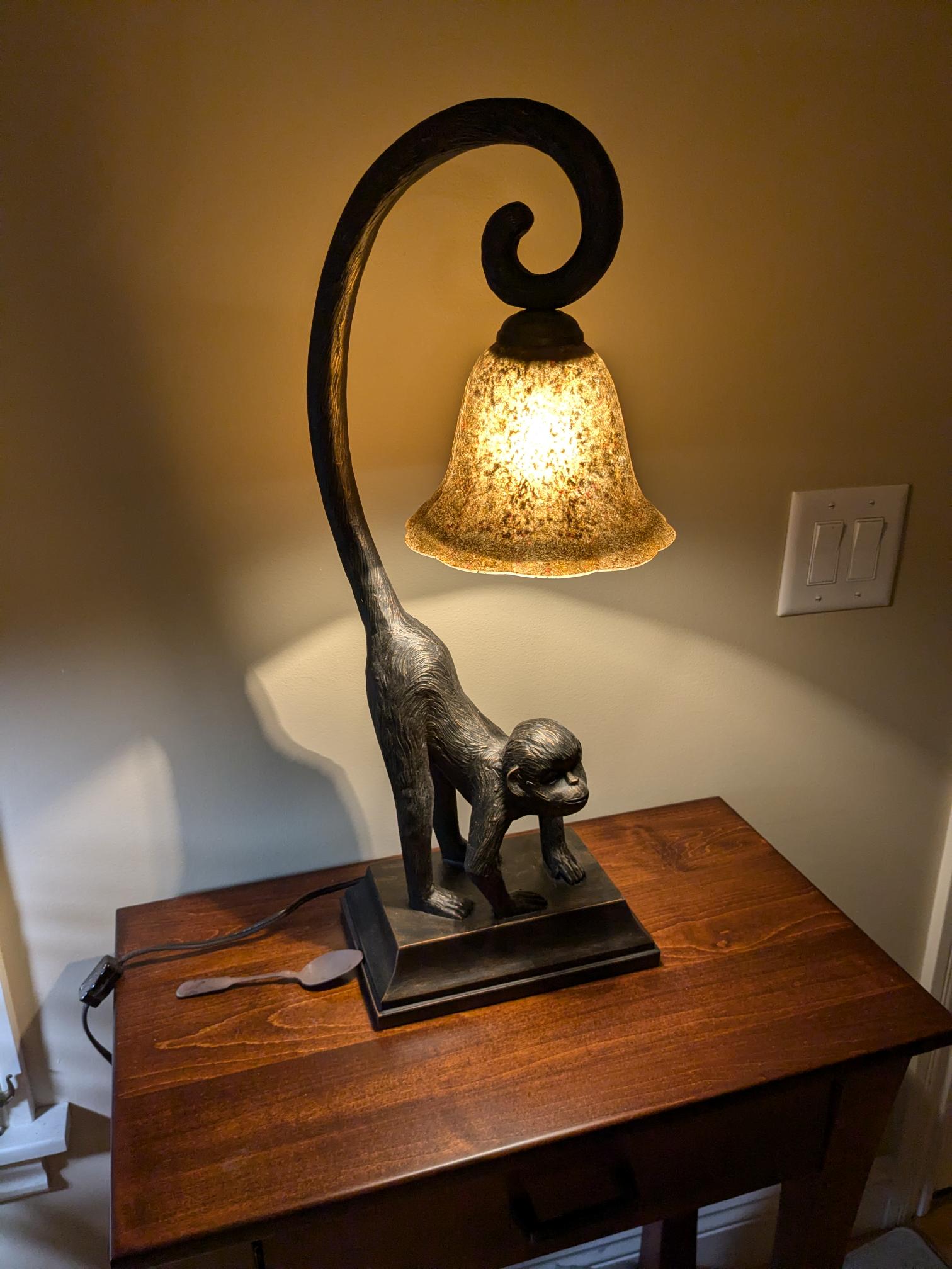 Inside there was plenty of artwork and interesting conversation pieces on the mantle and window ledges. I had to include a couple of pictures: one of the monkey lamps in the living room and a little parrot friend that welcomed the four of us.