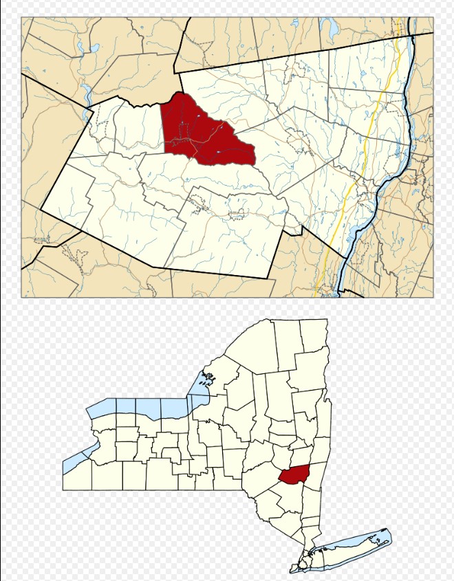 Like a nesting doll, the images below depict the Windham town limits within Greene County, and the county within New York state. The famous Hudson river is the bluish boundary to the right.