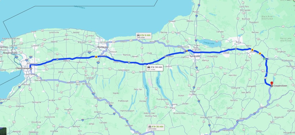 Cooperstown is a village within the town of Otsego, a Mohawk or Oneida word meaning ‘place of the rock’. It refers to Council Rock, a prominent rock partially submerged off the shore of Lake Otsego. It is home to around 1800 people and for a number of years, was famously known as the birthplace of baseball. If you recall the term ‘sister city’ from an earlier post, Cooperstown is twinned with Windsor, Nova Scotia, due to the latter’s claims of being the birthplace of hockey. The village attracts 260,000 tourists each year to the Baseball Hall of Fame, featured downtown on Main St. Founded by William Cooper in 1786, the village of Otsego was renamed in 1812 after he became a county judge and state congressman.