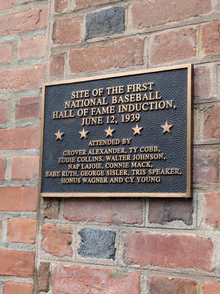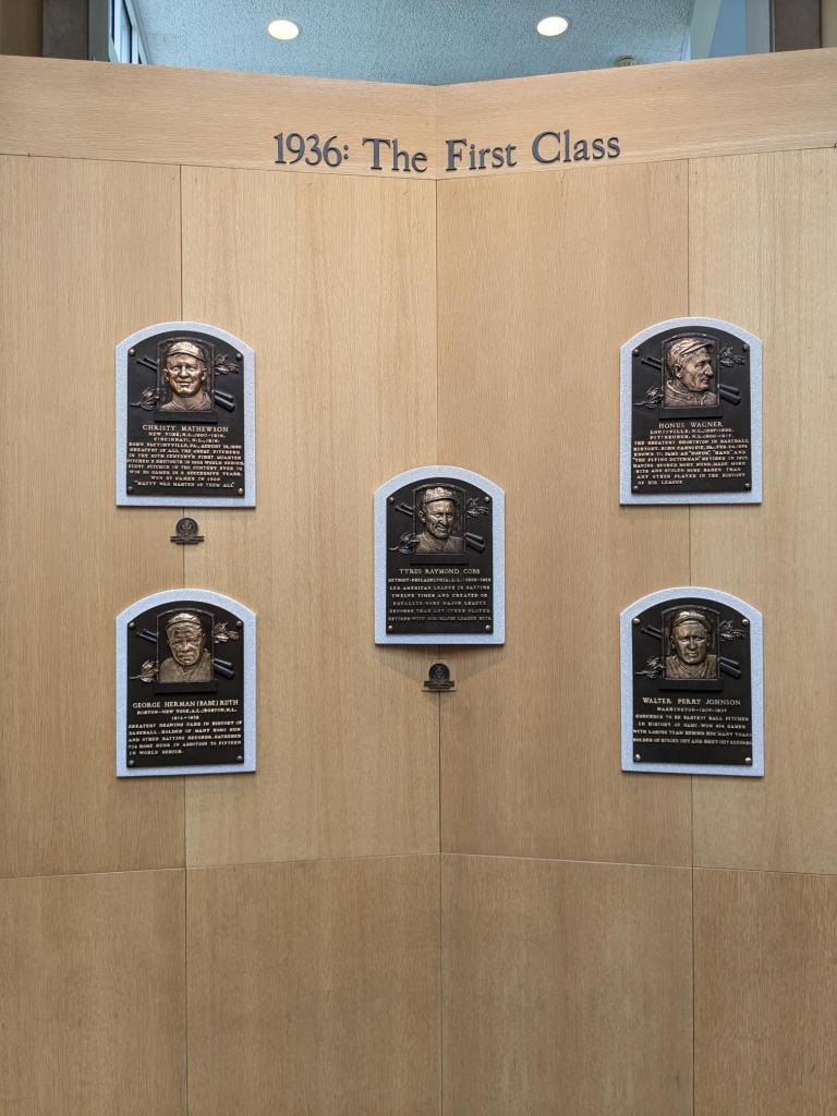 We begin with the placard that hangs to the right of the first door pictured above. It is to commemorate the first inductees. I have included ‘The First Class’ panel that sits at the far end of the actual hall that is attached to the museum. Of the class, Babe Ruth, Honus Wagner, Ty Cobb and Walter Johnson were in attendance. The missing member is Christy Mathewson, a pitcher who played until 1916 and won 373 major league games. Sadly, after serving in WW1, he passed in 1925 from tuberculosis at age 45.