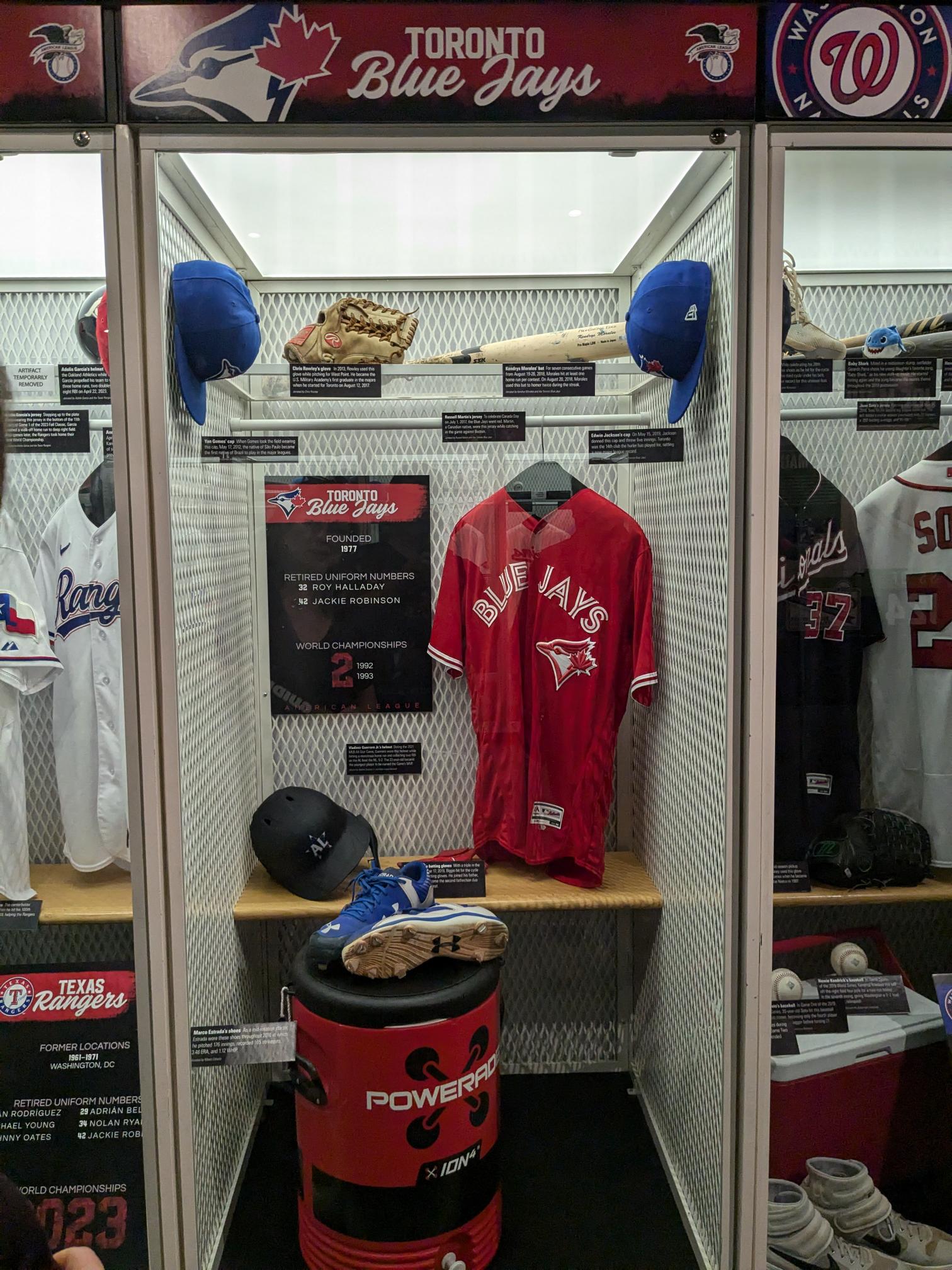 Below Centre: Every major league team has it’s own locker with game-used equipment from historical moments in their history. The most recent addition to the Toronto Blue Jays locker is the “AL” batting helmet worn by current star Vladimir Guerrero Jr during the 2021 All-Star Game. He homered and was the game’s MVP.