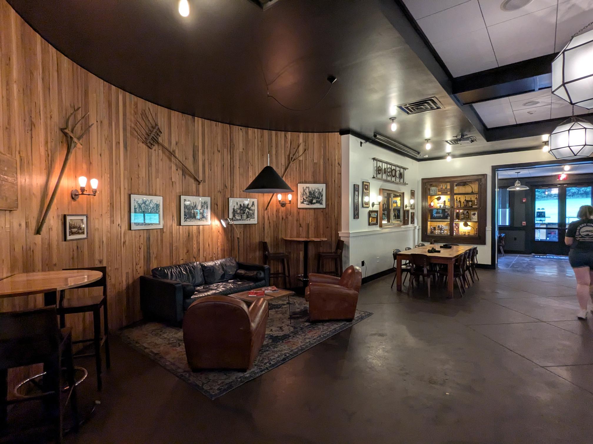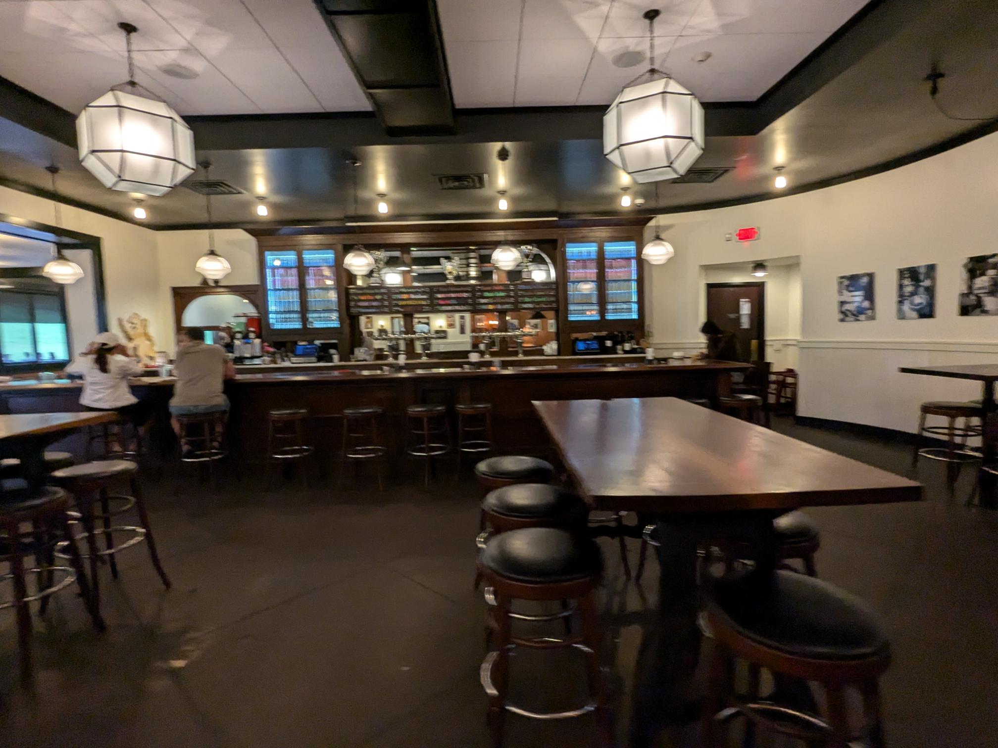 The taproom and outdoor settings were lovely. It was misty and damp on this occasion, but neither quelled our good spirits. The menu is limited but tasty. We munched on some brussel sprouts followed by the OMG burger and a side of macaroni salad. Unable to choose a brew, we opted for a flight that included a Witte, a wheat ale, Rare VOS, an amber with citrus notes, their flagship Three Philosophers, a Belgian quadrupel ale (9.7% abv!), and something called Bourbon Barrel-Aged Imperial Keep It Crunchy, a granola stout aged for 11 months (10.3%!!).