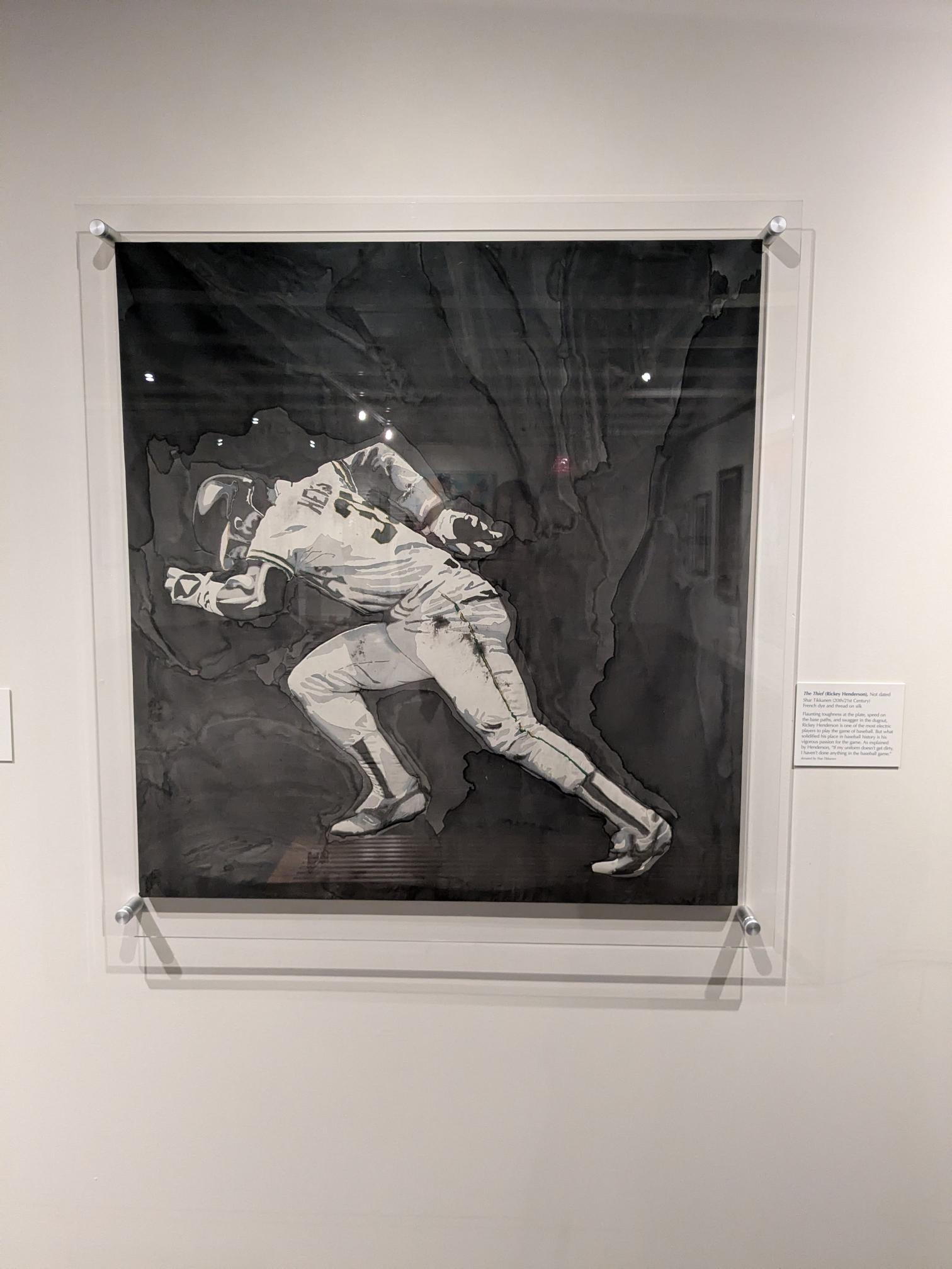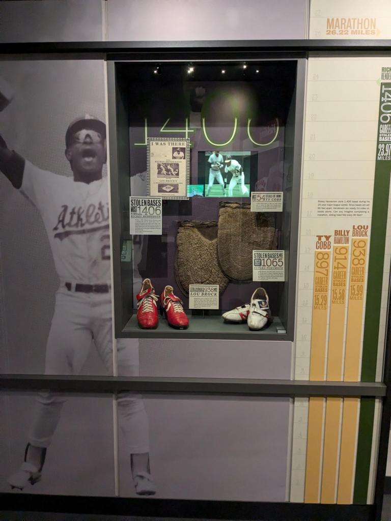 The next three shots pay homage to the “Man of Steal”, Rickey Henderson. Somewhat of a showboat, Rickey was known for speaking in the third person and tormenting pitchers both in the batter’s box and on the bases. Sadly, he passed away from pneumonia on Dec 20, five days short of his 66th birthday. He played 44 games for my beloved Jays in 1993, helping them to a second World Series title. Below is 1) artwork of Rickey early in his career (number 35, he switched to his famous 24 in 1985) with his customary head-down takeoff for second base, 2) his HoF plaque, and 3) a dedicated display of Rickey’s stolen base records. All time, his total of 1406 is 468 more than second place, and the active major league leader has a whopping 354, so his record is safe for awhile.